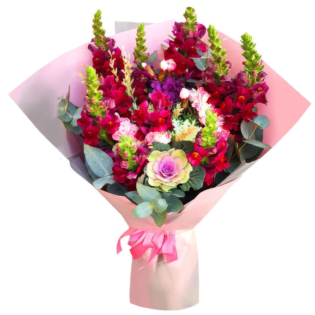 Львиный зев красный, брассика, эвкалипт. Упаковка (лента, пленка, крафт, сетка, пленка матовая)