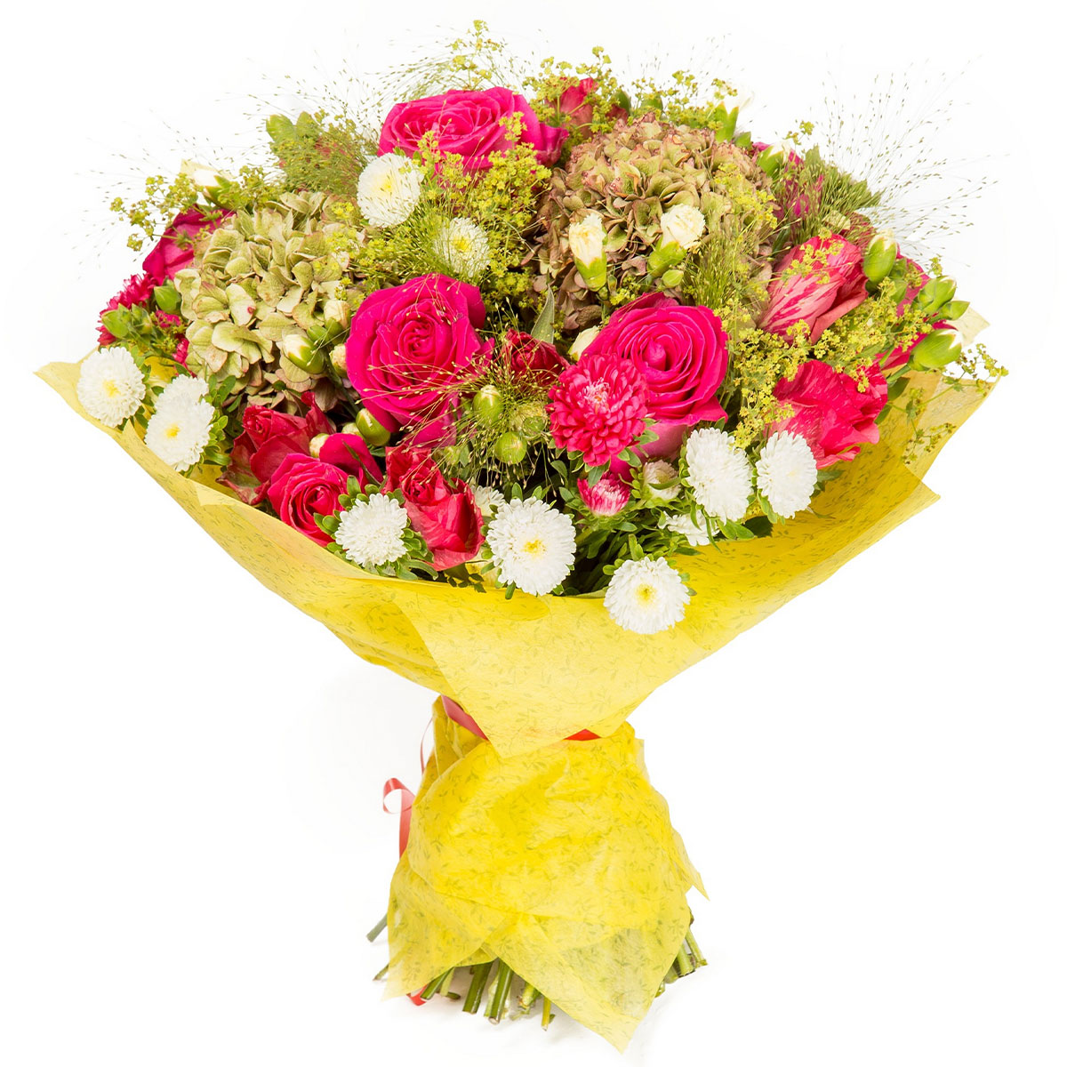 Роза одноголовая розовая, гортензия зеленая, маргаритка белая, зелень. Упаковка (лента, пленка, крафт, сетка, пленка матовая)