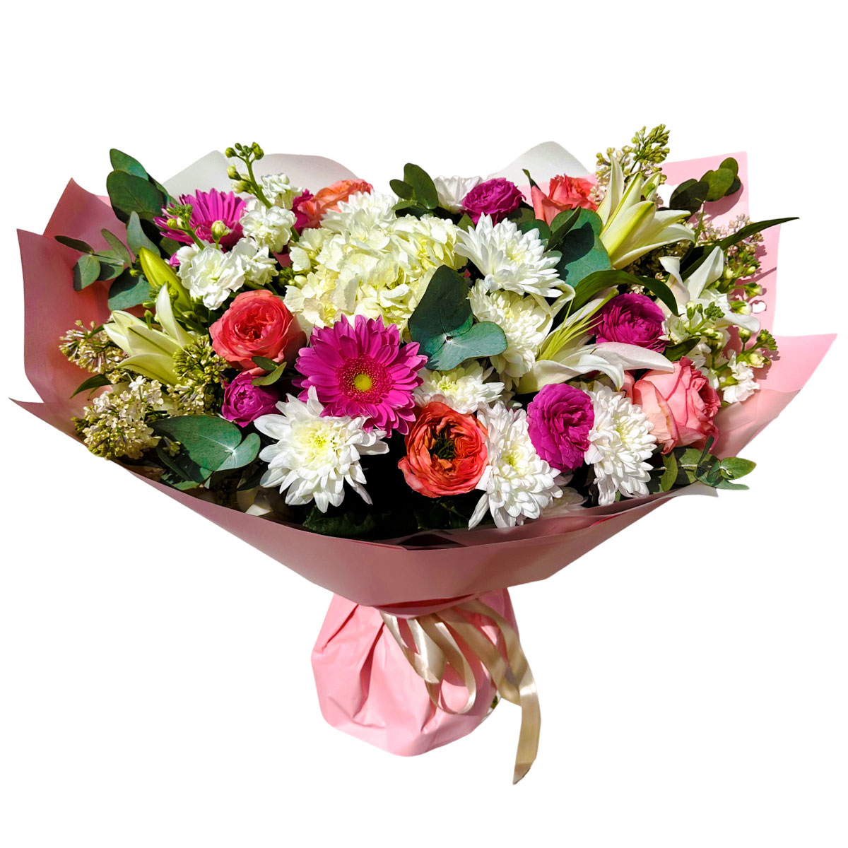 Гортензия белая, гербера сиреневая, хризантема белая, роза одноголовая розовая, лилия белая, маттиола белая, роза пионовидная розовая, эвкалипт. Упаковка (лента, пленка, крафт, сетка, пленка матовая)