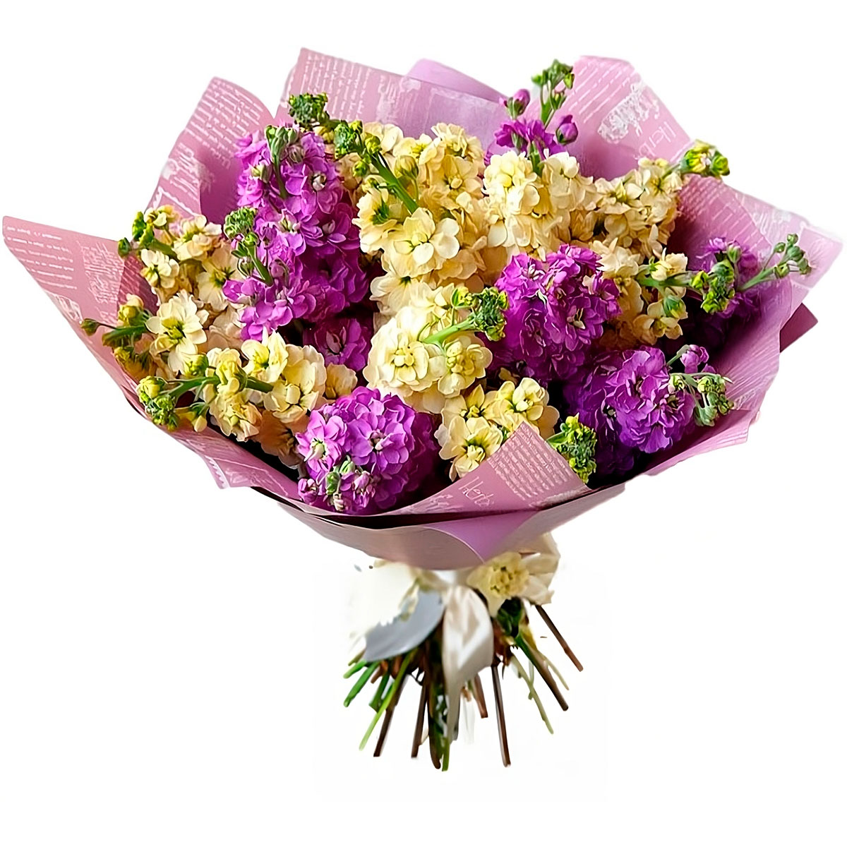 Маттиола фиолетовая, желтая, зелень. Упаковка (лента, пленка, крафт, сетка, пленка матовая)
