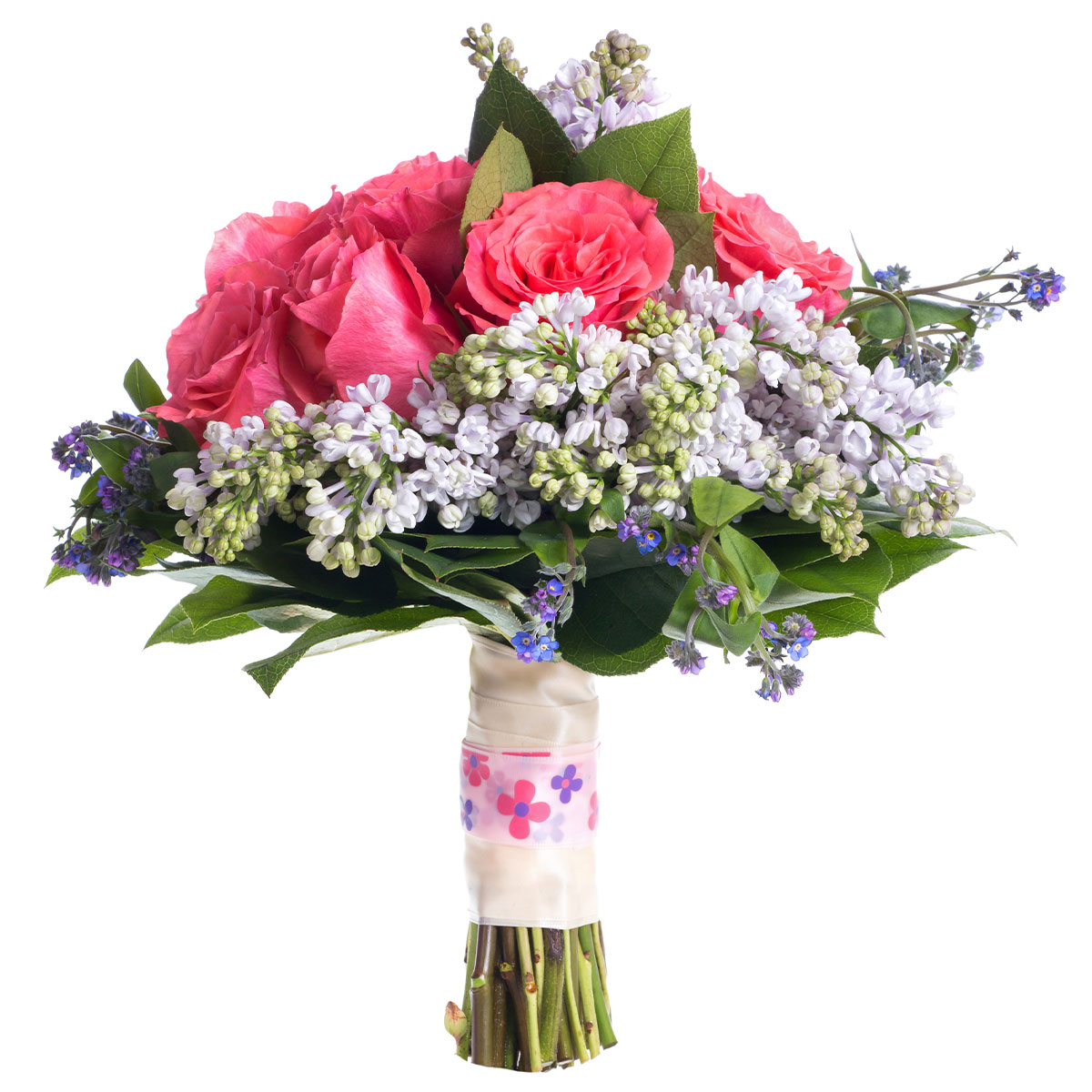 Роза одноголовая розовая, сирень, анютины глазки, зелень. Упаковка (лента, пленка, крафт, сетка, пленка матовая)
