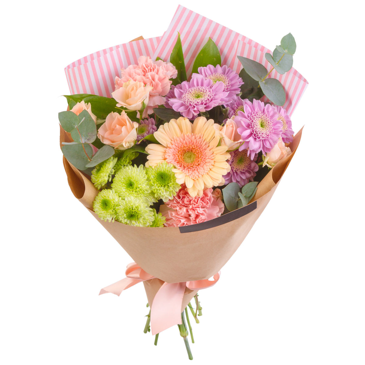 Гербера кремовая, хризантема кустовая зеленая и сиреневая, роза кустовая, гвоздика розовая, эвкалипт. Упаковка (лента, пленка, крафт, сетка, пленка матовая)