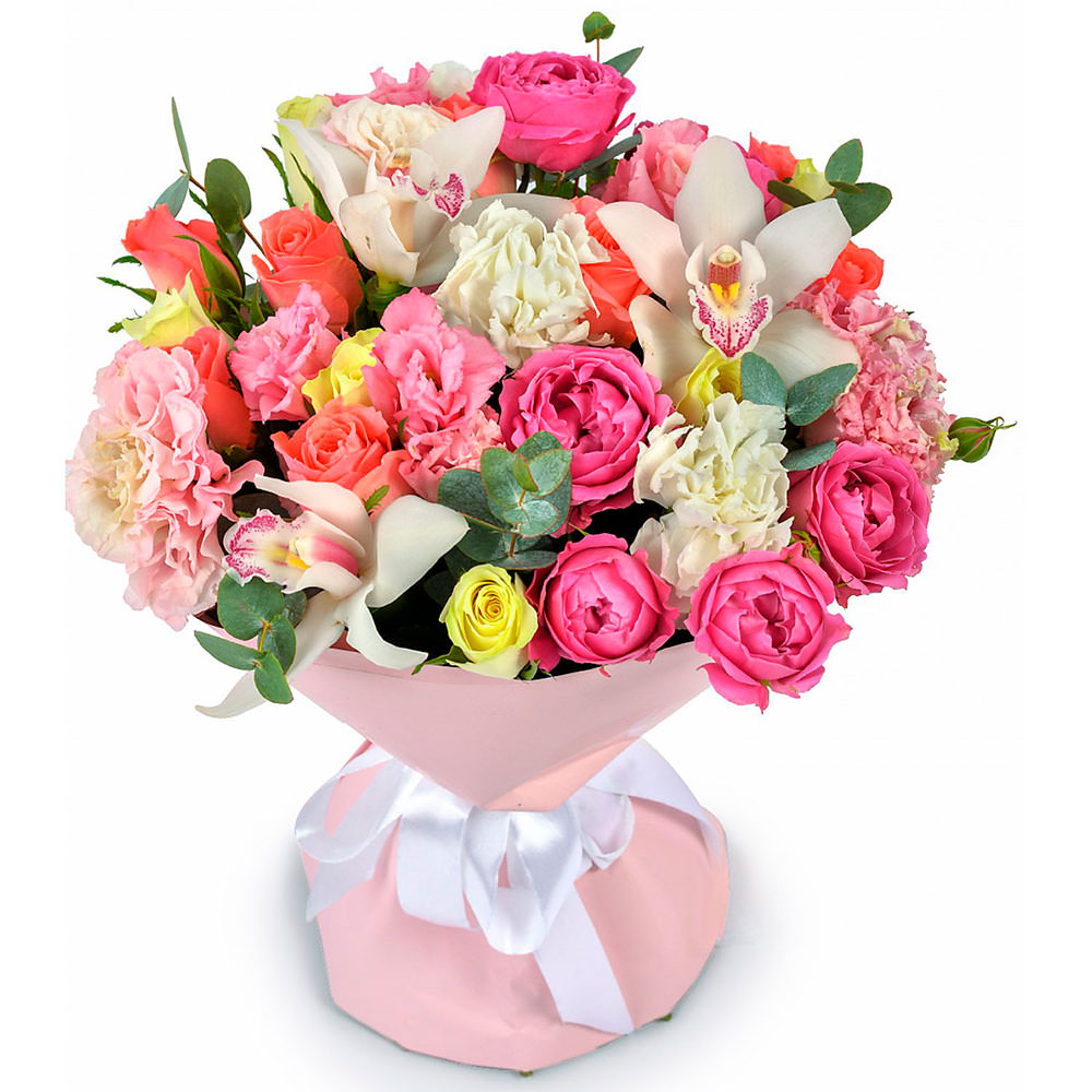 | Состав | Гвоздики, Кустовые розы, Орхидеи, Пионовидные розы, Розы, Эвкалипт |