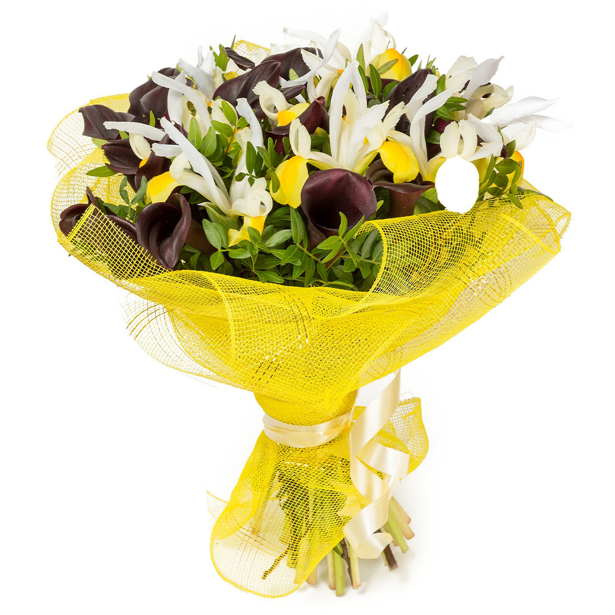 Ирис бело-желтый, калла бордовая, фисташка. Упаковка (лента, пленка, крафт, сетка, пленка матовая)