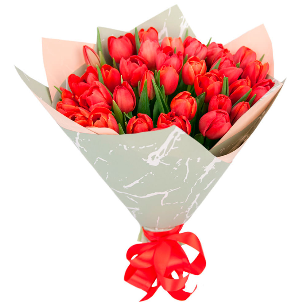 Тюльпаны красные. Упаковка (лента, пленка, крафт, сетка, пленка матовая)