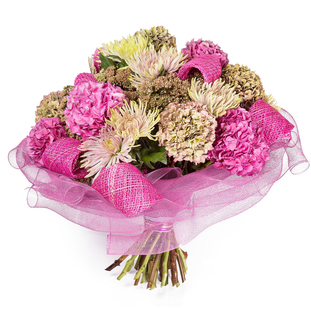 Гортензия розовая и кремовая, хризантема улыбка, озотамнус. Упаковка (лента, пленка, крафт, сетка, пленка матовая)