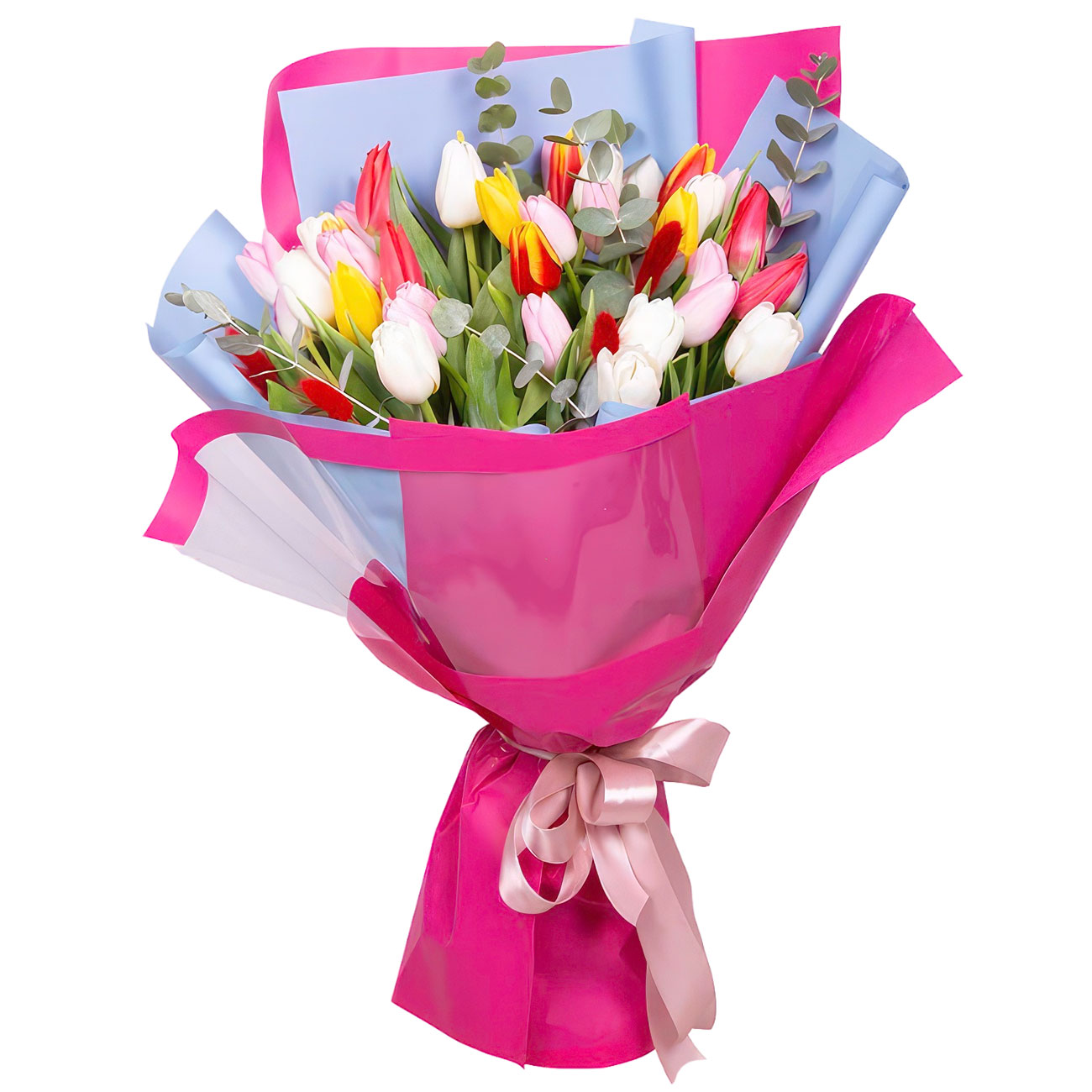 Тюльпан светло-розовый, розовый и желто-оранжевый, эвкалипт, зелень, лагурус красный. Упаковка (лента, пленка, крафт, сетка, пленка матовая)