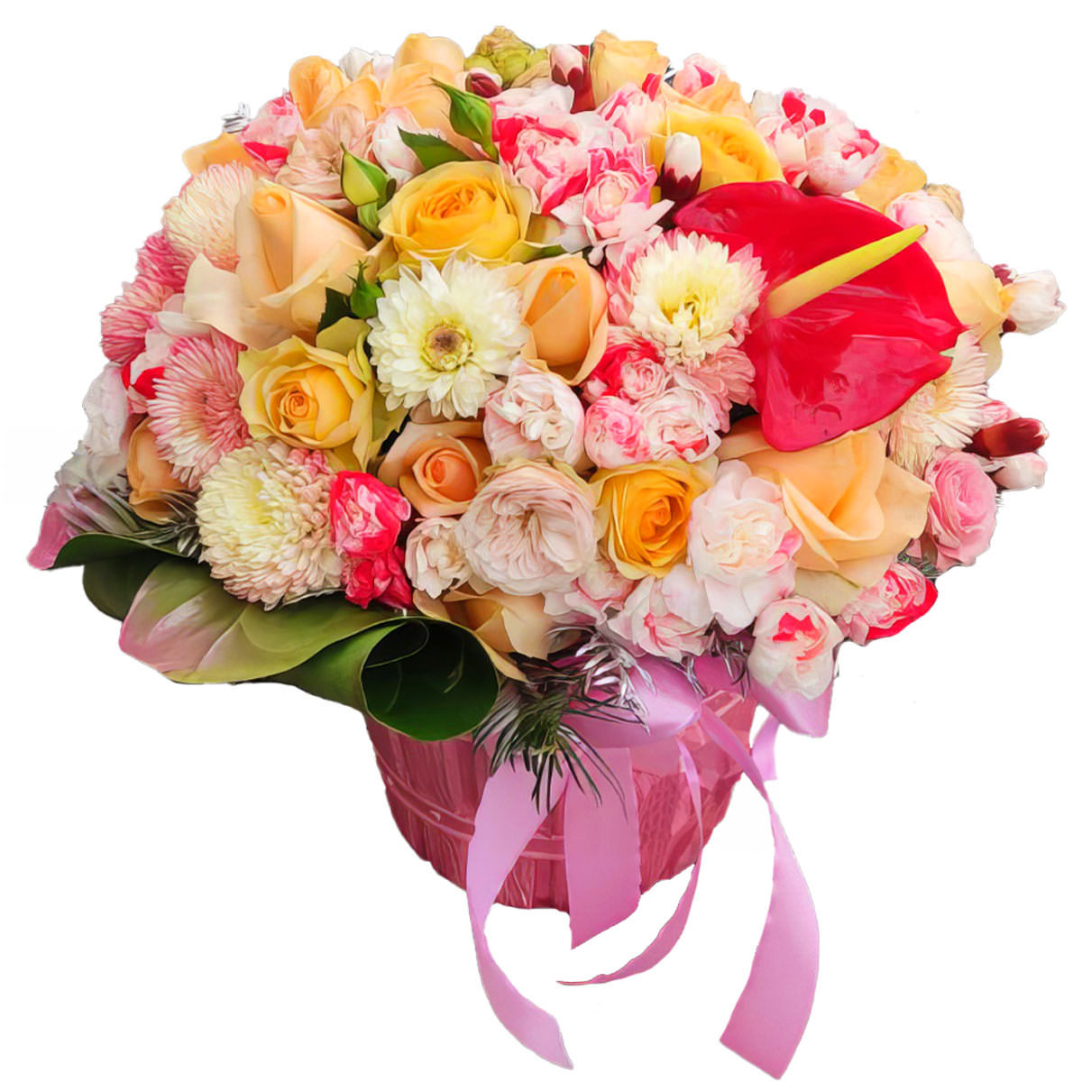 Роза одноголовая кремовая, роза кустовая желтая, роза кустовая пионовидная розовая, антуриум, хризантема кустовая розовая. Упаковка (Корзина, оазис, ящик).