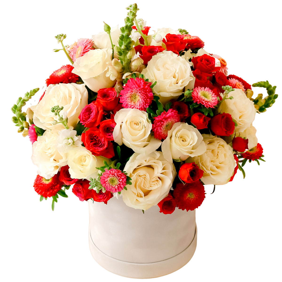 Роза одноголовая кремовая, роза кустовая красная, хризантема кустовая розовая, львиный зев. Упаковка (шляпная коробка, квадратный бокс, коробка сердце, оазис)