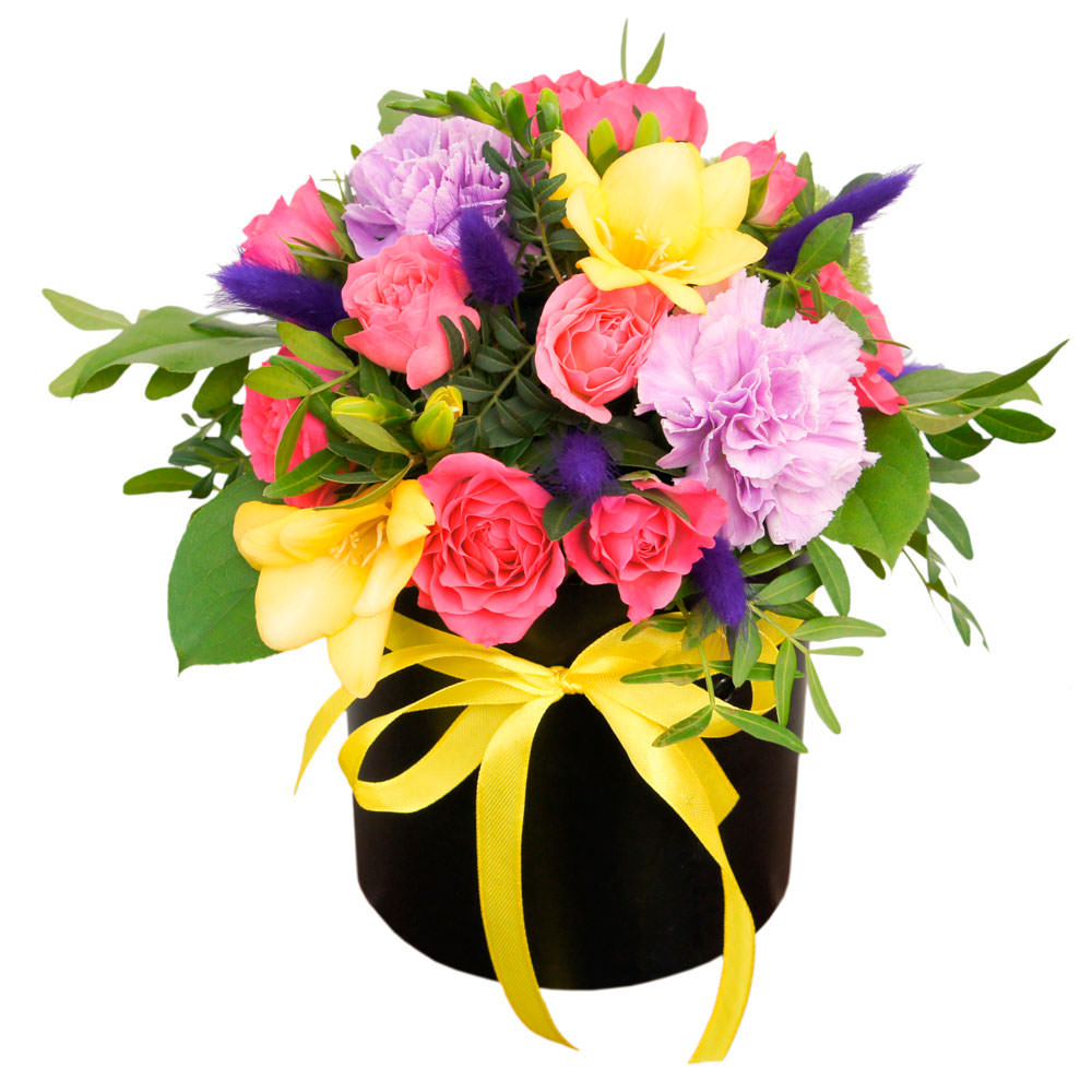 Фрезия желтая, роза одноголовая розовая, гвоздика сиреневая, фисташка, зелень, сухоцвет. Упаковка (шляпная коробка, квадратный бокс, коробка сердце, оазис)