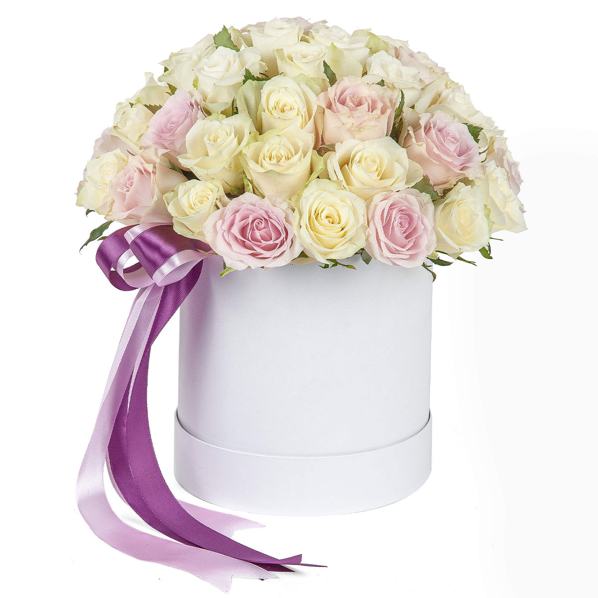 Роза одноголовая кремовая и сиреневая. Упаковка (шляпная коробка, квадратный бокс, коробка сердце, оазис)