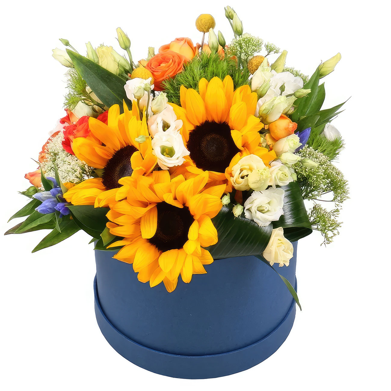 Подсолнух, роза кустовая оранжевая, ирис, эустома белая, зелень. Упаковка (шляпная коробка, квадратный бокс, коробка сердце, оазис)
