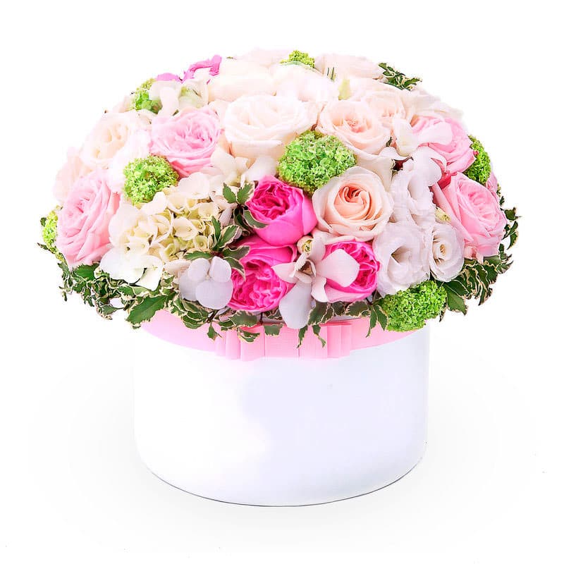 Роза одноголовая микс (кремовая, розовая), гортензия белая, орхидея белая, бересклет, эустома белая, зелень. Упаковка (шляпная коробка, квадратный бокс, коробка сердце, оазис).