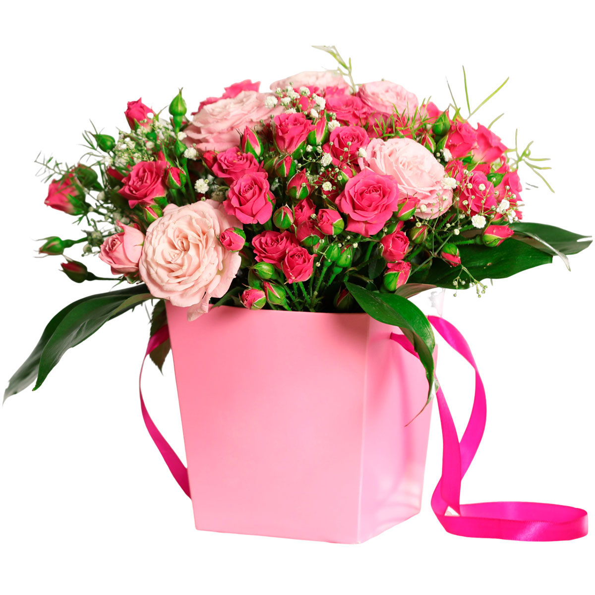 Роза пионовидная светло розовая, роза кустовая розовая, гипсофила, аспидистра. Упаковка (шляпная коробка, квадратный бокс, коробка сердце, оазис)