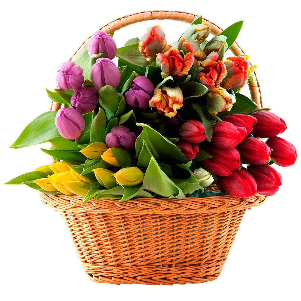Цветы в корзинке «Микс тюльпанов» с доставкой по г Олонец: вы можете заказать букет в гипермаркете цветов «Флормания» по цене от 3590 руб.